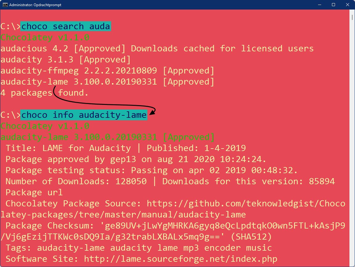 Overigens kun je ook rechtstreeks online zoeken via www.kwikr.nl/chopack, waarna je meteen het bijbehorende installatiecommando kunt overnemen. Met de extra parameter --verbose krijg je uitgebreidere informatie en met –limitoutput krijg je uitsluitend de programmanaam en versie te zien.