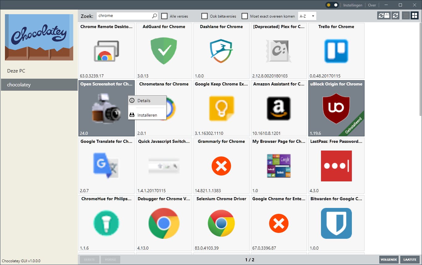 Na de installatie vind je de app netjes terug in het startmenu van Windows. Start je het programma op, dan krijg je direct een overzicht van de geïnstalleerde pakketten te zien, inclusief logo, naam en versienummer. Tenminste, als je aan de linkerkant Deze PC hebt geopend. Open je hier chocolatey, dan krijg je meteen een overzicht van de online softwarecatalogus.