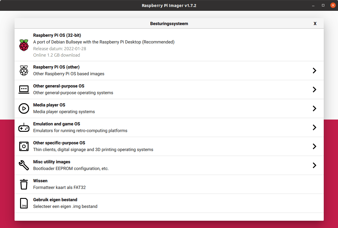 In de andere hoofdcategorieën vind je bijvoorbeeld Ubuntu, mediaspeler-besturingssystemen zoals LibreELEC, emulatiesystemen zoals RetroPie en zelfs Home Assistant OS. Klik je op de laatste categorie, Gebruik eigen bestand, dan kun je zelf een eerder gedownload image selecteren. En met Wissen wis je een microSD-kaartje en formatteer je het opnieuw met een FAT32-bestandssysteem.