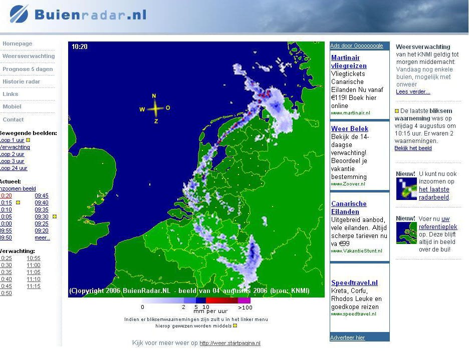 Het is hollen of stilstaan in Nederland - hoewel 'hozen of stilstaan' nu toepasselijker is. Wie plannen heeft voor komend weekend, raden wij daarom Buienradar.nl van harte aan...Op BuienRadar.NL zijn de buienradar-beelden van het KNMI te zien. Wat daar bijzonder aan is? Tot voor kort werden deze beelden met ruim een uur vertraging getoond of moest men er voor betalen. Op BuienRadar zijn ze meteen te zien - gratis. Daarnaast kunt u ook kijken naar de regenvoorspelling voor het komende uur, kijken waar het onweert én de beelden mobiel te volgen. Handig voor kampeerders dus...