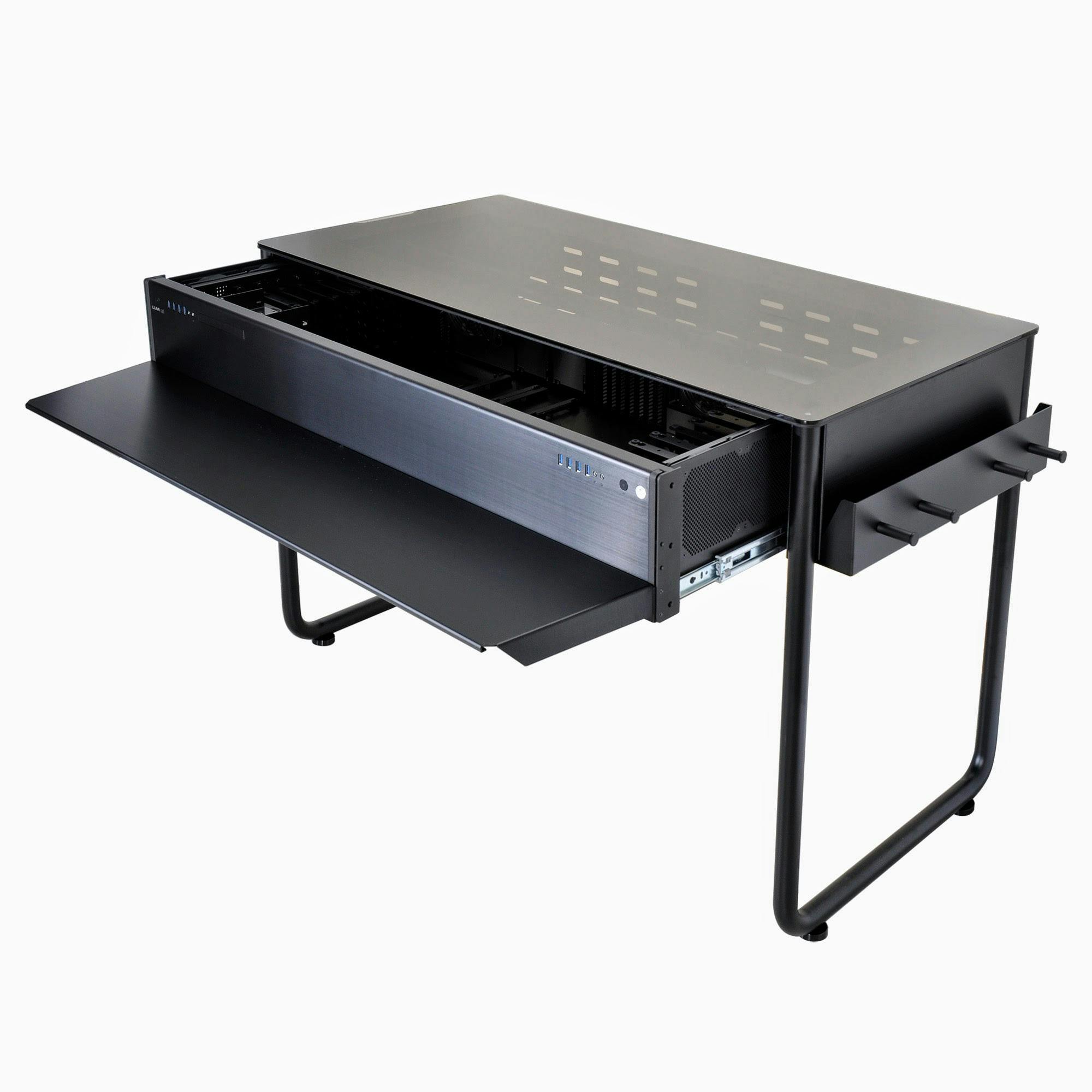 Lian Li is een fabrikant van luxe behuizingen voor pc’s voor echte liefhebbers. Anders dan de kasten van de meeste andere merken zijn deze niet vervaardigd uit staal en plastic, maar uit aluminium en glas. Zo ook de DK-01X, die in twee imposante dozen arriveert. U dient deze ‘desk’ wel nog even zelf in elkaar te zetten. Dat kost een uurtje schroeven, maar dan staat het geheel wel, compleet met een gehard glazen bovenplaat. Overigens is het verstandig bij het monteren direct de hoogte goed in te stellen – de poten zijn verstelbaar, maar daarvoor moet wel het halve bureau gedemonteerd worden.