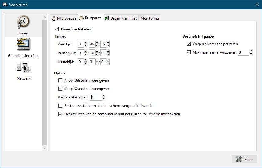 De opties op de eerste drie tabbladen (Micropauze, Rustpauze en Dagelijkse limiet) werken hetzelfde. Je kunt de timers in- en uitschakelen, je geeft Werktijd, Pauzeduur en Uitsteltijd aan in uren, minuten en seconden. Ook geef je aan of er een knop moet zijn waarmee je de pauze kunt Uitstellen of Overslaan.