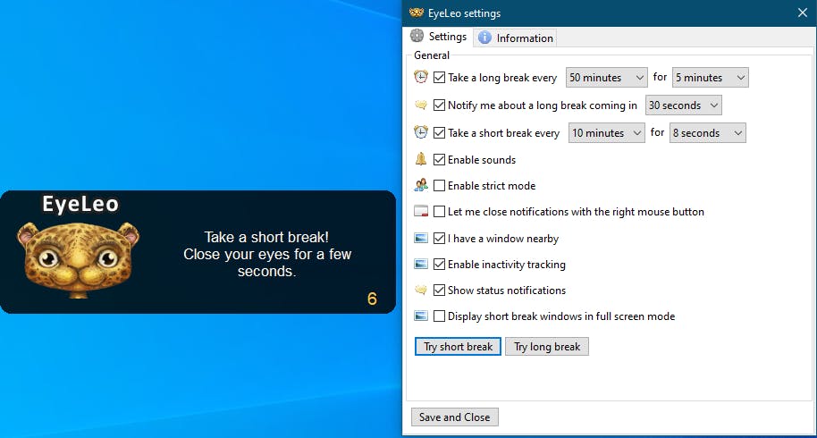 EyeLeo is pauzesoftware die zich specifiek richt op het voorkomen van oogkwalen. Je configureert de tool vanuit het Windows-systeemvak via Settings.