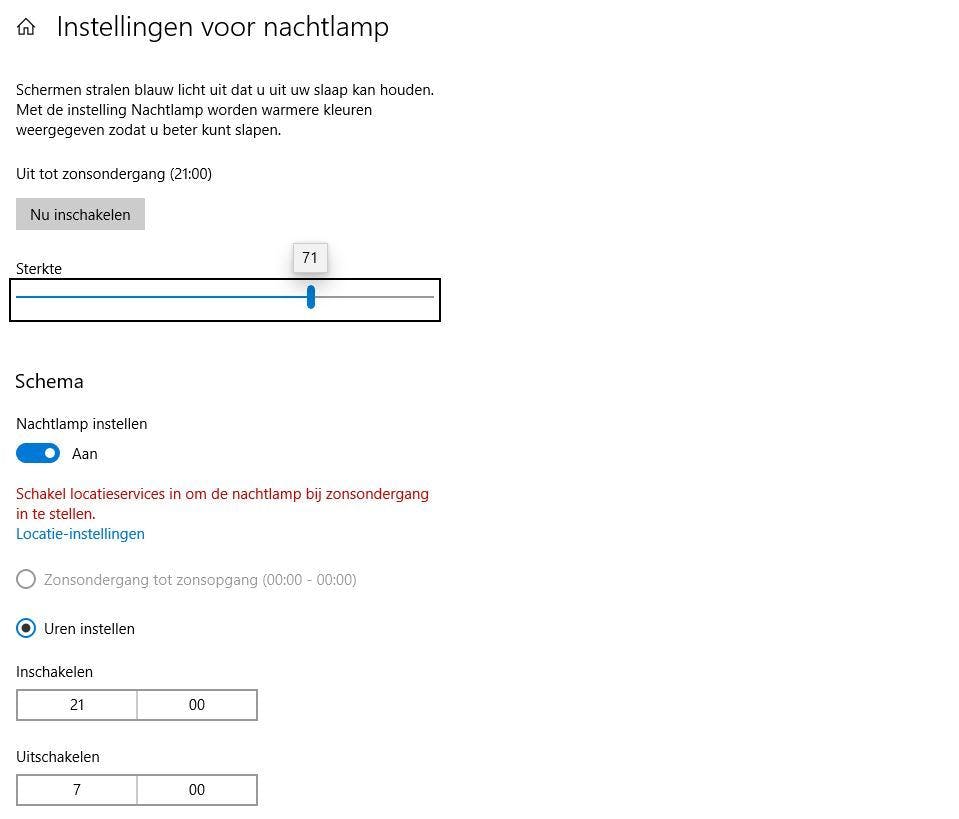 Ook vanuit Windows 10 kun je de kleurtemperatuur regelen. Ga naar Instellingen / Systeem / Beeldscherm / Instellingen voor nachtlamp / Nu inschakelen. Hoe meer je de schuifknop naar rechts verplaatst, hoe warmer (minder blauw) het schermlicht wordt.