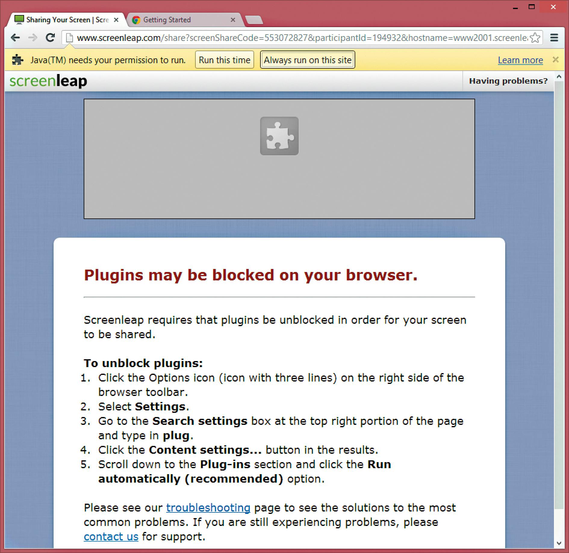 U bent nu klaar om uw scherm met anderen te delen, althans als u over een moderne browser beschikt. Volgens de makers van Screenleap presteert hun toepassing het best in Google Chrome, gevolgd door Firefox, Safari en Internet Explorer. Wij volgen het advies en starten dus Chrome. U hoeft vervolgens maar naar www.screenleap.com te surfen. U kunt zich bij deze dienst registreren (zie stap 7) maar noodzakelijk is dat niet, zodat u meteen de knop Share your screen now mag indrukken. Geef toestemming als de plugin daarom vraagt.