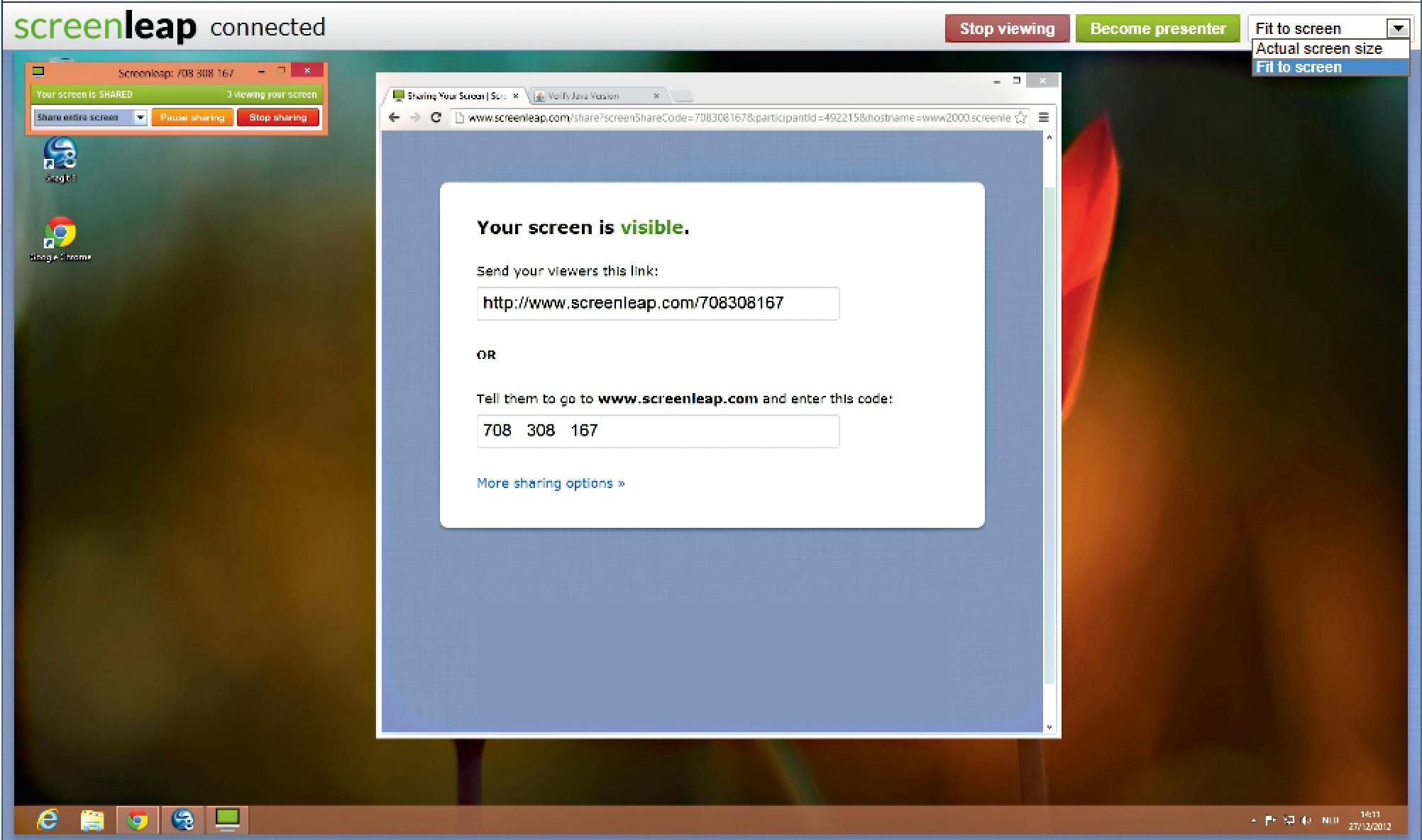 Over naar ontvangerszijde nu… Die heeft dus inmiddels de link ontvangen. De link aanklikken volstaat. Hij of zij krijgt dan vrijwel onmiddellijk uw gedeelde scherm te zien binnen de contouren van het browservenster. Blijkt dat scherm groter dan het browservenster, dan is het doorgestuurde beeld alsnog netjes binnen dat venster te krijgen via het pijltje rechtsboven, waar hij of zij Fit to Screen kiest in plaats van Actual screen size.