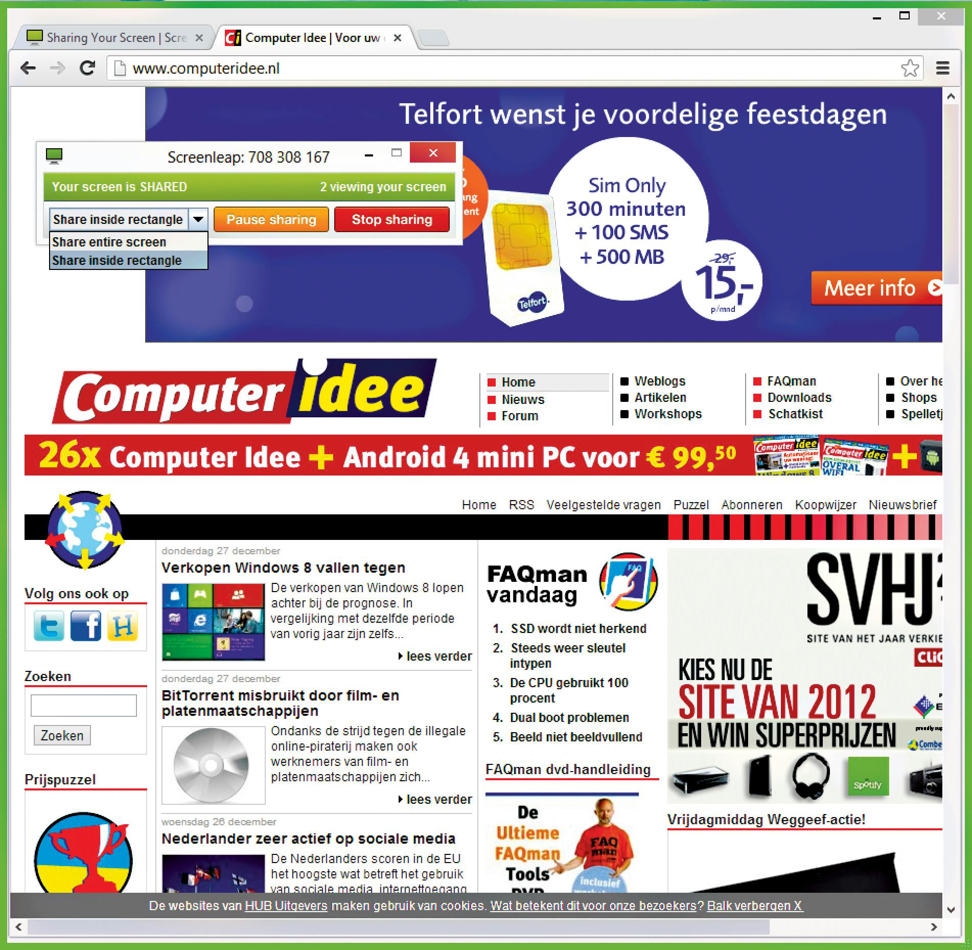 Stel, een kennis zit met een computerprobleem dat hij of zij graag aan u wil voorleggen. Of u bent met een project bezig en wilt snel even overleggen met een paar collega’s. Alleen… die kennis of die collega’s zijn niet in de buurt. Geen zorgen: met Screenleap is een beeldscherm zó tussen hen en u gedeeld!