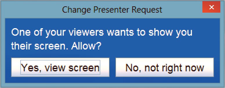 Het kan natuurlijk gebeuren dat u te midden van een demonstratie de rollen graag even had omgekeerd: in plaats van uw scherm naar iemand anders door te sturen had u ook het scherm van die andere persoon willen zien. Dat kan! De ontvanger hoeft slechts het groene knopje Become presenter aan te klikken. Op uw scherm ziet uzelf dan meteen de vraag opduiken of u het scherm van een van uw ontvangers (viewers) wil bekijken. Antwoordt u die vraag bevestigend, dan krijgt u op uw beurt het schermbeeld van hem of haar doorgestuurd.