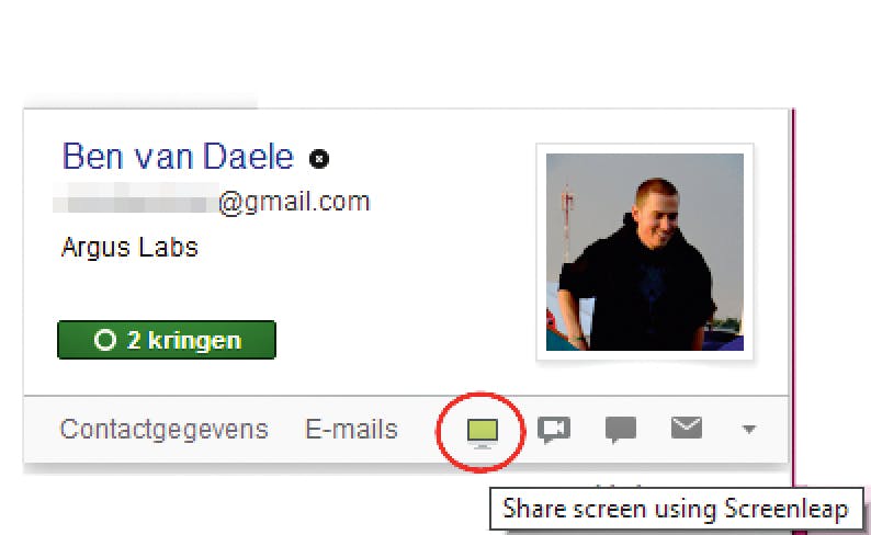Geef toe: makkelijker dan Screenleap kan het nauwelijks. Hoewel… bent u een fervent Gmail-gebruiker en zou u het wel leuk vinden uw scherm geregeld met een of meer contactpersonen te delen, dan is de plugin Screenleap for Gmail vast iets voor u. U vindt deze browser-plugin op www.screenleap.com/extension/gmail/install en die laat zich installeren in Chrome, Firefox of Safari. Als u zich vervolgens bij Gmail aanmeldt, zult u op verschillende plaatsen een Screenleap-knop zien. Zo ook wanneer u de muis even boven de naam van een van uw contactpersonen houdt: linksonder treft u dan een knopje aan om uw scherm te delen.