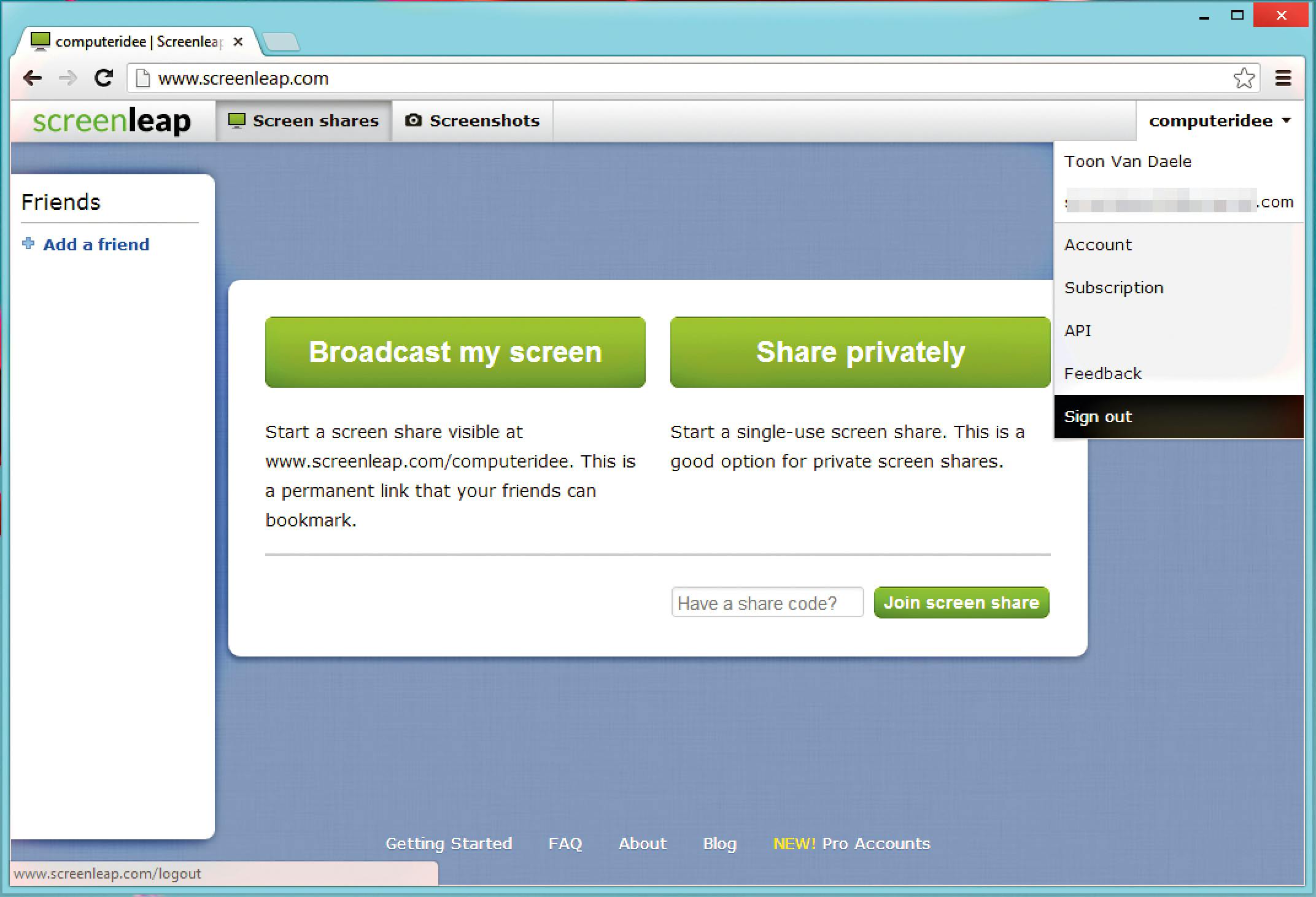 Gebeurt het wel vaker dat u met dezelfde mensen een scherm wilt delen, dan kan dat zelfs zonder het sturen van een link. Wat zou u ervan denken om uzelf een permanent adres als www.screenleap.com/<uwnaam> toe te eigenen, zodat een bezoekje aan dit adres volstaat om uw gedeelde scherm te zien verschijnen! Dat is perfect mogelijk, maar het vereist wel een gratis registratie bij Screenleap. Klik op Sign in en vervolgens op Don’t have an account. Vul de gevraagde gegevens in, evenals uw ‘handle’. Dat is het stukje tekst dat achteraan uw persoonlijke webadres komt. Meldt u vervolgens aan bij Screenleap en kies Broadcast my screen. Iedereen die de browser afstemt op www.screenleap.com<uwhandle>, krijgt uw schermbeeld te zien. Vergeet op het einde van de rit dus zeker niet op de knop Stop sharing te drukken!