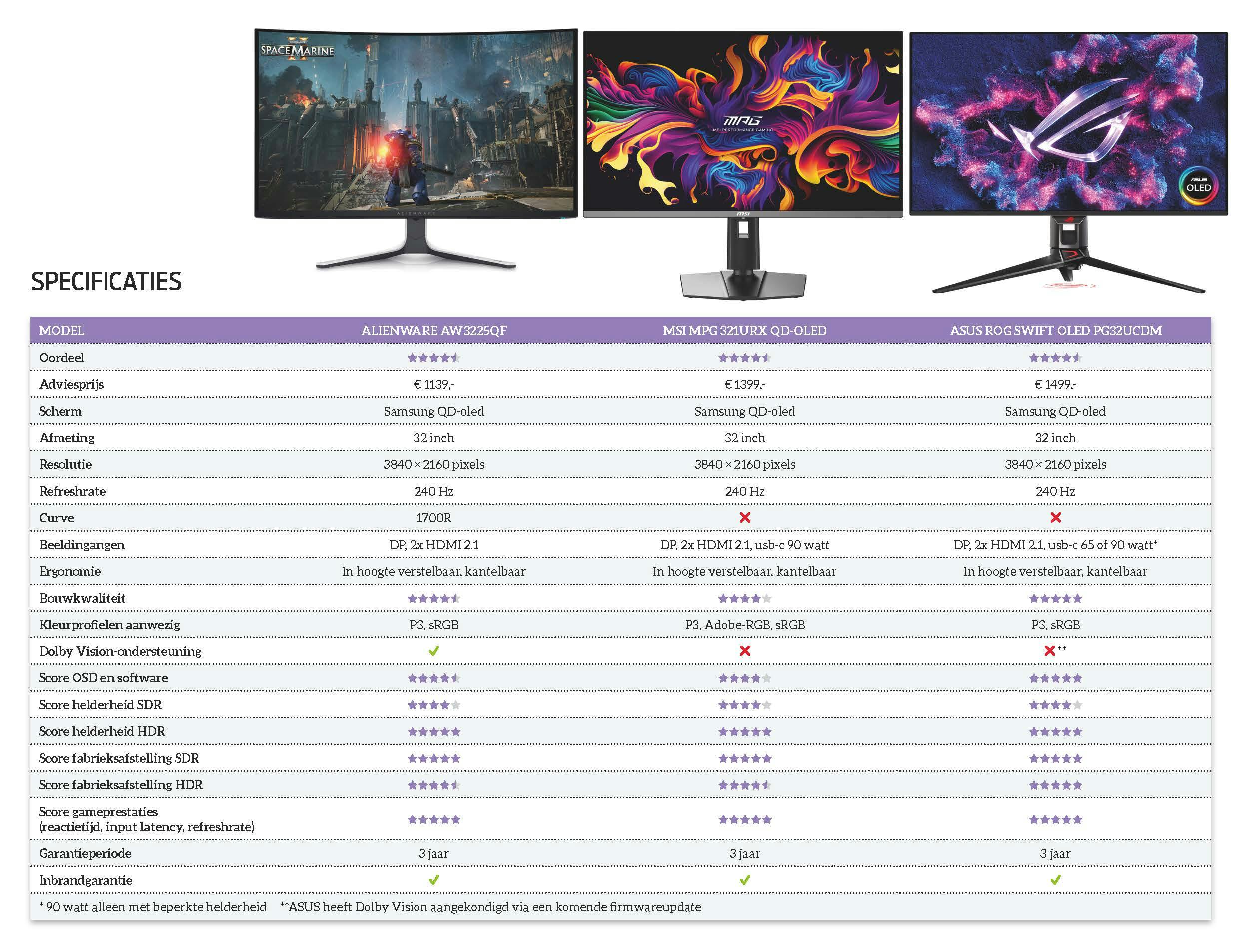 Verschillen zijn er echter wel. Alienware biedt als enige Dolby Vision, terwijl ASUS en MSI weer een usb-c-aansluiting hebben. MSI is dankzij het hogere vermogen op dat punt het meest interessant en heeft bovendien een AdobeRGB-profiel.