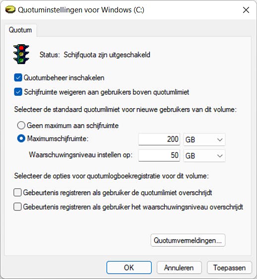 Vervolgens activeer je de optie Maximumschijfruimte, zodat je bij Maximumschijfruimte een bepaalde grenswaarde kunt typen. Daaronder stel je het waarschuwingsniveau in. Wanneer de gebruiker dit niveau bereikt, zal hij een waarschuwing zien.