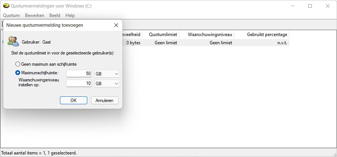 De functie Schijfquota werkt in Windows 10 en in Windows 11 op exact dezelfde manier. De waarden liggen niet voor eeuwig vast. De beheerder kan steeds extra ruimte aan iemand toewijzen als een andere gebruiker die ruimte in zijn quotum niet gebruikt. Maak voor je begint een herstelpunt voor de zekerheid.
