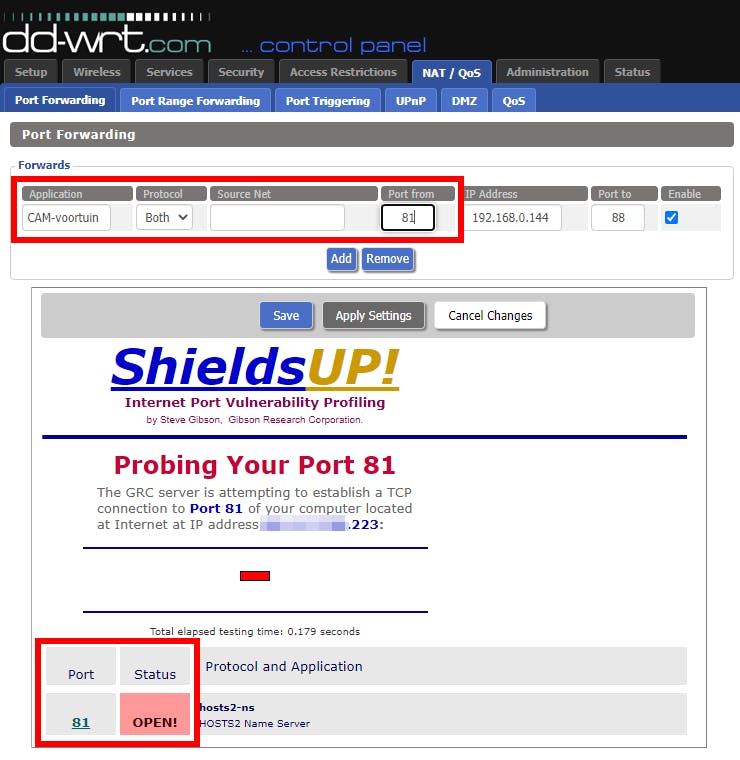 In de afbeelding hierboven zie je dat poort 81 tijdens onze tests openstond. Dat kwam doordat we in onze router een portforwarding-regel hadden gedefinieerd die alle verkeer voor poort 81 naar een ip-camera doorstuurde. Nu is portforwarding nooit de veiligste oplossing, maar al helemaal niet als je er geen ip-filtering op toepast, zodat alleen bekende ip-adressen toegang krijgen. Een veel robuustere oplossing is via VPN (zoals OpenVPN), maar dit valt buiten de context van dit artikel.