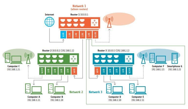 Je zult merken dat de apparaten van je buitenste subnet de toestellen van het binnenste niet zomaar kunnen benaderen, maar het omgekeerde kan nog steeds. Geef je de voorkeur aan twee volledig gescheiden subnetten, dan heb je nog een derde router nodig. Hierbij vertak je de primaire router via de lan-poorten rechtstreeks naar de andere twee routers, een zogenoemde Y-opstelling. Daar kijken we tenslotte nog even naar.