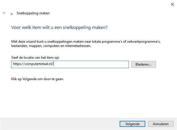 Vervolgens ga je naar het Bureaublad en klik je met de rechtermuisknop op een lege plek. Klik nu op Nieuw, Snelkoppeling en op de lege ruimte waar de link moet komen te staan (bij Geef de locatie van het item op). Vervolgens plak (Ctrl+V) je daar de link en klik je op Volgende. Bepaal nog even een handige naam en klik dan op Voltooien.