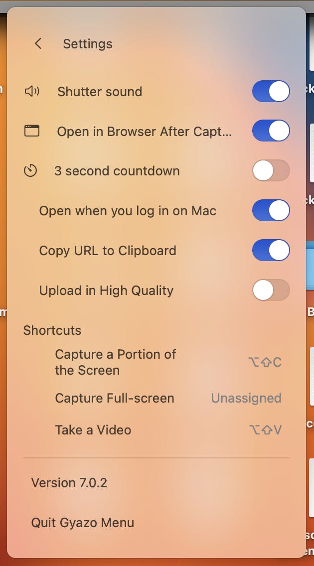 In het Instellingen-menu vind je verder nog een aantal handige opties. Zo kun je Gyazo automatisch laten openen als je inlogt op je computer, zodat de app altijd gebruiksklaar is. Je kunt het geluid aan- of uitzetten, een countdown van drie seconden instellen, of ervoor zorgen dat de url automatisch naar je klembord wordt gekopieerd om hem nog sneller te kunnen delen.