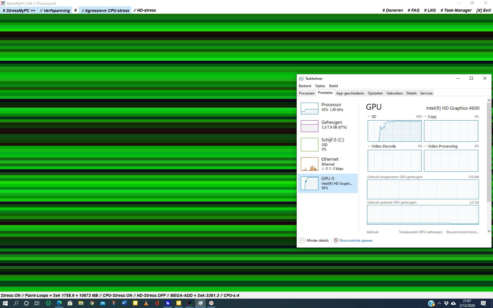 De cpu-test verloopt op dezelfde manier. Je klikt op Agressive CPU-stress en daarna activeer je de test via de knop StressMyPC. Hetzelfde geldt voor de knop HD-Stress. Op deze manier kun je ook twee of drie stresstests simultaan laten lopen. Aan de rechterkant staan de knoppen om de taalinstelling te wijzigen en vind je de knop om Windows Taakbeheer te starten. Als je dat niet doet, voer je een stresstest op blind gevoel uit. In Taakbeheer zie je in het tabblad Prestaties hoe StressMyPC de zweep legt op de processor, de harde schijf en gpu. Eventueel kun je met de app Broncontrole ook de belasting van de verschillende onderdelen volgen.