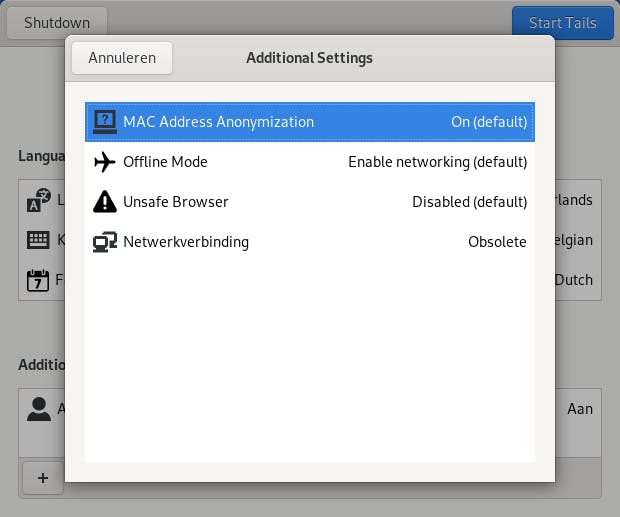 Unsafe Browser schakel je uitsluitend in om je bij een netwerk met een ‘captive portal’ aan te kunnen melden. MAC Address Anonymization laat je ingeschakeld, tenzij je verbindingsproblemen ondervindt met je netwerkinterface(s). Offline Mode is handig als je geen internetconnectie nodig hebt. Met Start Tails start je de desktopomgeving op.