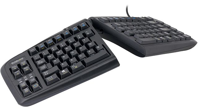 Het gespleten toetsenbord is een andere optie. Dit is een toetsenbord dat bestaat uit twee onderdelen, vaak in de vorm van twee vierkanten. Omdat je de toetsen precies kunt positioneren, kunnen je polsen in een neutrale positie op je bureau leunen. Vanwege het design van deze keyboards kan het zijn dat sommige knoppen op een andere plek zitten dan normaal, maar ook dit is een kwestie van wennen.