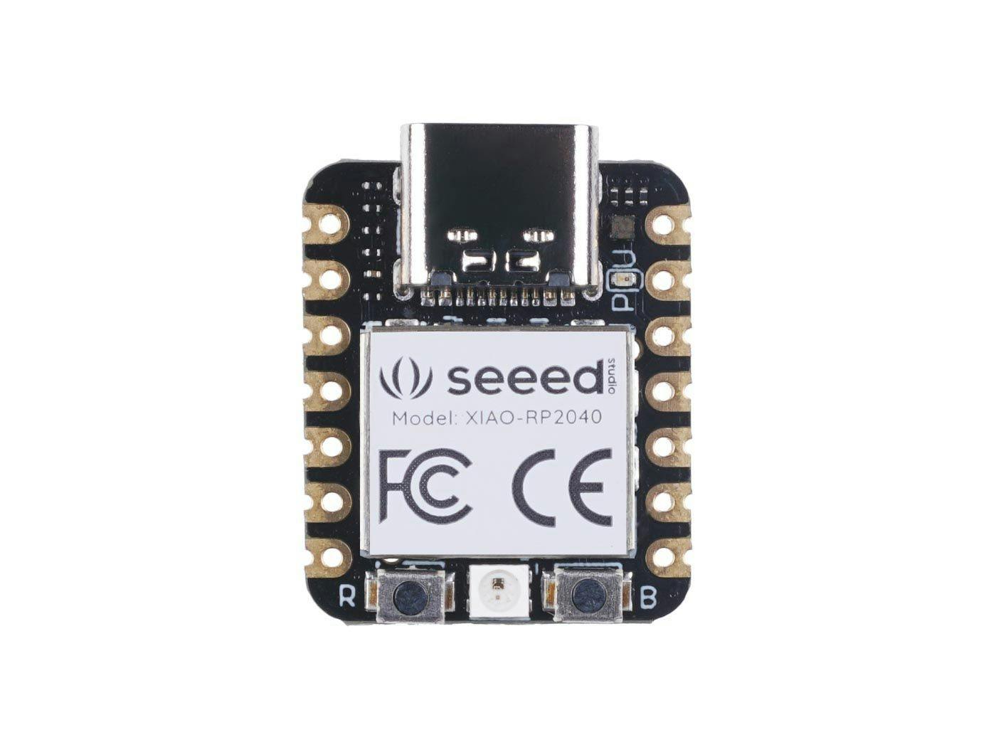 Waarschijnlijk de kleinste telg in de RP2040-familie is de Seeed XIAO RP2040, die maar 20 × 17,5 mm meet. Dat heeft natuurlijk zijn weerslag op het aantal GPIO-pinnen: dat zijn er maar 11. Die zijn wel allemaal met PWM te gebruiken en 4 ervan ook als analoge pin. Op de onderkant heb je ook pads voor SWD. De Seeed XIAO RP2040 is uitgerust met 2 MB flashgeheugen, een usb-c-connector, een gewone led en een NeoPixel-RGB-led. In feite maken deze specificaties van de Seeed XIAO RP2040 gewoon een kleinere versie van de Raspberry Pi Pico met een RGB-led.