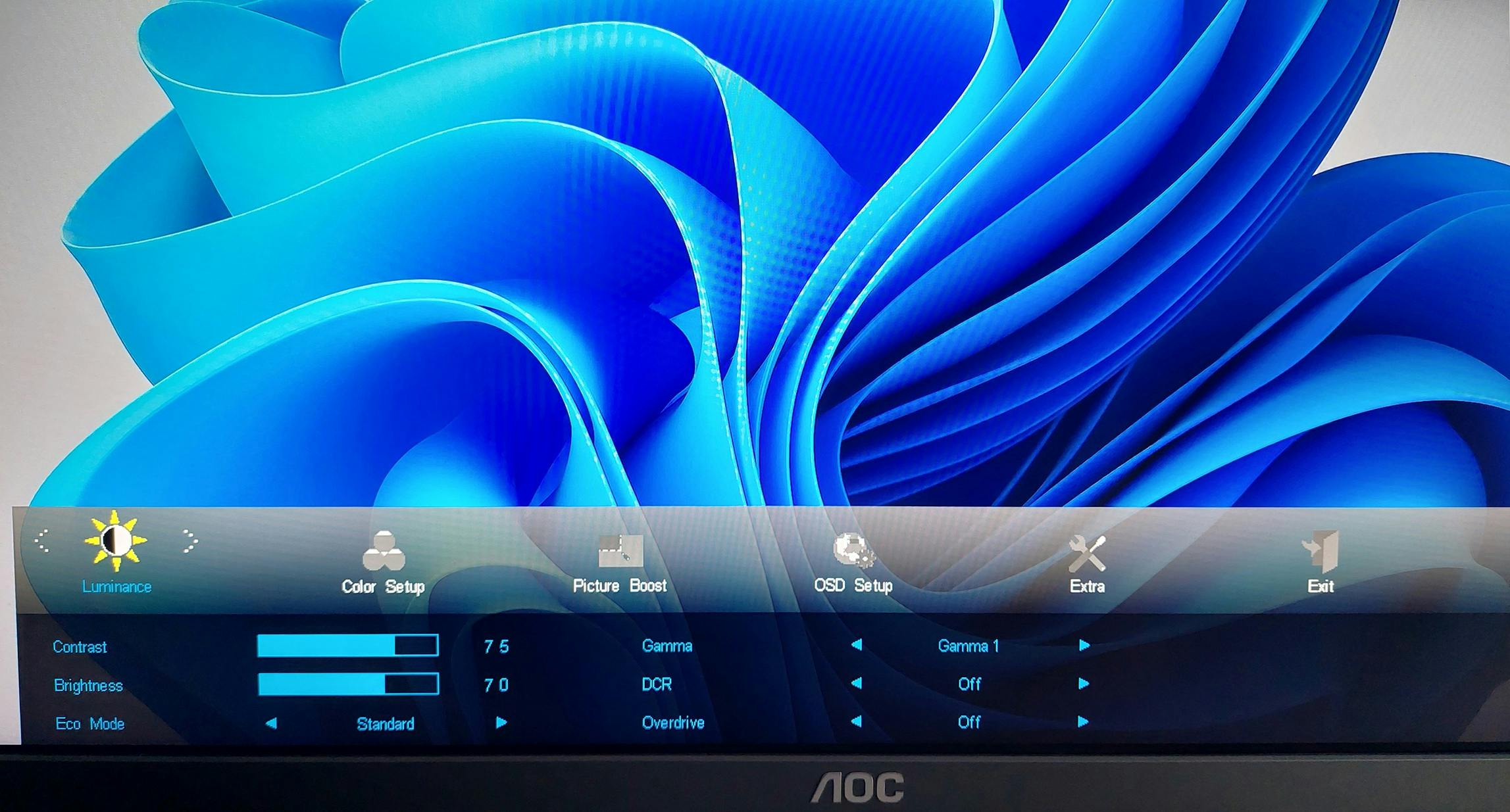 Een typisch OSD-menu voor regeling van helderheid, contrast, kleur en meer (hier een AOC-monitor).