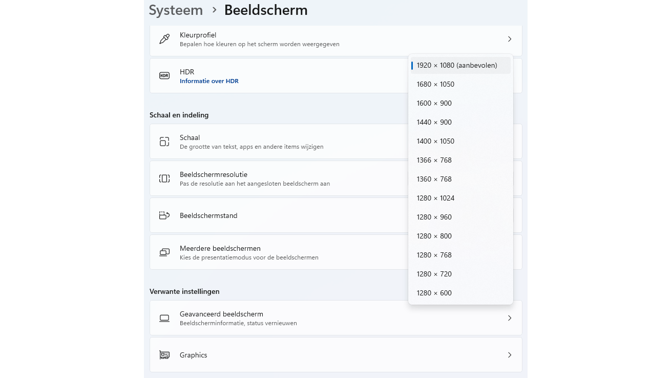 Windows geeft doorgaans zelf de aanbevolen resolutie en schaal aan.