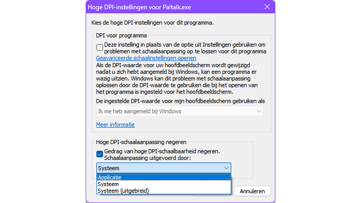 De schaal die Windows instelt, wordt normaliter hoger naarmate de dpi-grootte toeneemt, bijvoorbeeld 100% bij circa 96 dpi, 150% bij 144 dpi en 200% bij 192 dpi. Werkt dat dus niet goed, plaats dan een vinkje bij Gedrag van hoge DPI-schaalbaarheid negeren. Probeer het eerst met Applicatie (wellicht beheert deze de dpi-schaalaanpassing zelf beter) en daarna met Systeem of Systeem (uitgebreid). Je kunt ook een vinkje plaatsen bij Deze instelling in plaats van […] en kiezen tussen de dpi-instellingen die actief waren tijdens je Windows-aanmelding of de actuele (en inmiddels misschien aangepaste) dpi-instellingen die gelden bij het opstarten van de toepassing.
