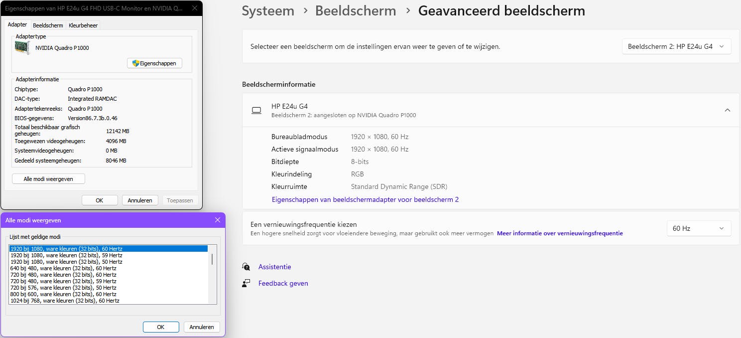 Nog meer opties vind je door op de link Eigenschappen van beeldschermadapter voor beeldscherm [x] en vervolgens op Alle modi weergeven te klikken. Afhankelijk van je beeldscherm en gpu kun je hier uit verschillende verversingsfrequenties kiezen, in combinatie met de resolutie en bitdiepte (het aantal bits per pixel, gebruikt voor alpha- (transparantie) en rgb-kleurkanalen).