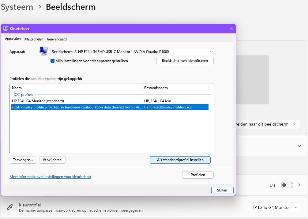 De kalibratiewizard van Windows creëert na afloop automatisch een zogenaamd icc-kleurprofiel, wat standaard opgeslagen wordt in de map %SystemRoot%\System32\spool\drivers\color. Zo’n profiel bevat gegevens die de kleurkenmerken van je beeldscherm beschrijven, zodat kleuren consistent worden weergegeven. Je ziet dit wanneer je naar Instellingen / Systeem / Beeldscherm gaat: bij Kleurprofiel staat na de kalibratie iets als sRGB display profile with display hardware configuration data derived from calibration. Of je treft hier het kleurprofiel aan dat tijdens de driverinstallatie vanuit de fabrikant is meegekomen. Zo’n schermprofiel van de fabrikant is op zich prima, maar weet dat de kleurweergave ook wordt beïnvloed door de leeftijd van het scherm en het omgevingslicht. Daarom is het verstandig af en toe een nieuwe kalibratie uit te voeren (bij ‘normaal’ omgevingslicht).