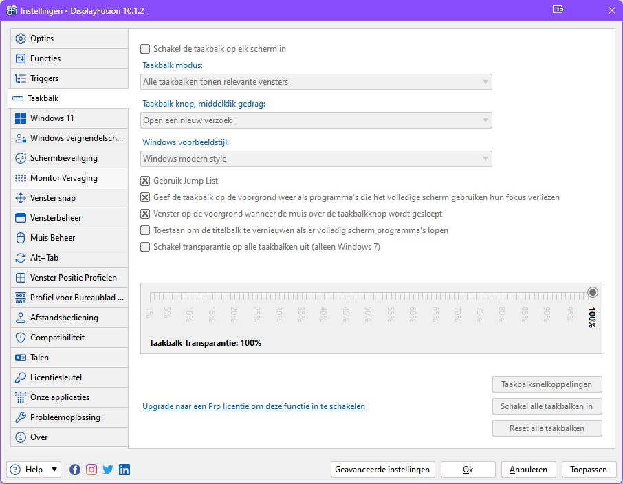 We nemen DisplayFusion als voorbeeld. Gebruik je dit programma voor de eerste keer, dan krijg je een korte voorstelling van de interessantste functies. Via Configureer DisplayFusion stel je alle opties naar wens in, verdeeld over twintig rubrieken zoals Functies, Triggers, Taakbalk, Schermbeveiliging, Monitor Vervaging en Afstandsbediening. Blauw gekleurde items zijn niet beschikbaar in de gratis versie (behalve tijdens de proefperiode van 30 dagen). Een upgrade naar de Pro-versie kost circa 34 dollar (ruim 30 euro), maar biedt veel extra functies. Je kunt bijvoorbeeld vensters automatisch of bij bepaalde triggers naar specifieke monitors verplaatsen, vensters op alle monitors indelen in vooraf bepaalde gebieden, inactieve monitors laten dimmen, bureaubladachtergronden uitgebreid configureren en tussen verschillende monitorprofielen schakelen.
