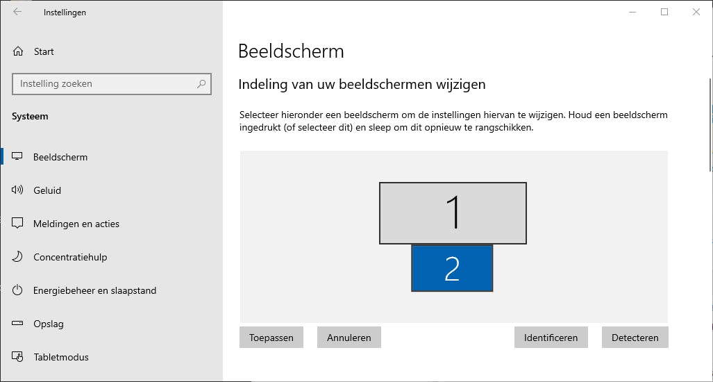 Kies een beeldscherm en versleep het naar de juiste positie ten opzichte van het andere scherm. Zijn de schermen correct uitgelijnd? Klik op Toepassen. Om te achterhalen welk scherm je aanpast, klik je op Identificeren. Het unieke cijfer maakt duidelijk met welk scherm je te maken hebt. Via Detecteren laat je Windows opnieuw zoeken naar aanwezige beeldschermen. Die functie werkt alleen correct als de schermen zijn ingeschakeld.