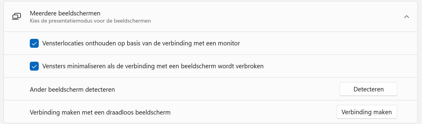 Verder vind je de optie Vensters minimaliseren als de verbinding met een beeldscherm wordt verbroken. Die optie zorgt ervoor dat de vensters op een extern scherm razendsnel naar de taakbalk op het overgebleven scherm worden geminimaliseerd, zodra je het scherm loskoppelt. Hiermee voorkom je dat de vensters kwijtraken.