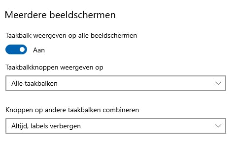Verder kun je bij de optie Taakbalkknoppen weergeven op aangeven op welke taakbalk de knoppen moeten worden getoond. Die optie is van belang als je op elk beeldscherm een taakbalkknop toont en er dus sprake is van een hoofdtaakbalk en een subtaakbalk. Tot slot bepaal je hoe de knoppen op de andere taakbalken moeten worden getoond. Kies de optie Altijd, labels verbergen of de opties Wanneer taakbalk vol is of Nooit.