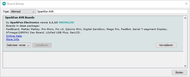 Klik dan op OK. Ga naar Hulmiddelen / Board en kies Board Beheer. Je kunt nu SparkFun AVR Boards opzoeken in de lijst. Selecteer deze en kies Installeer. Hierna selecteer je de vrij universele SparkFun Pro Micro onder Hulpmiddelen / Board / SparkFun AVR Boards. Zorg daarna dat je onder Hulpmiddelen / Processor de juiste uitvoering van je bordje (meestal 5V/16 MHz) hebt gekozen!
