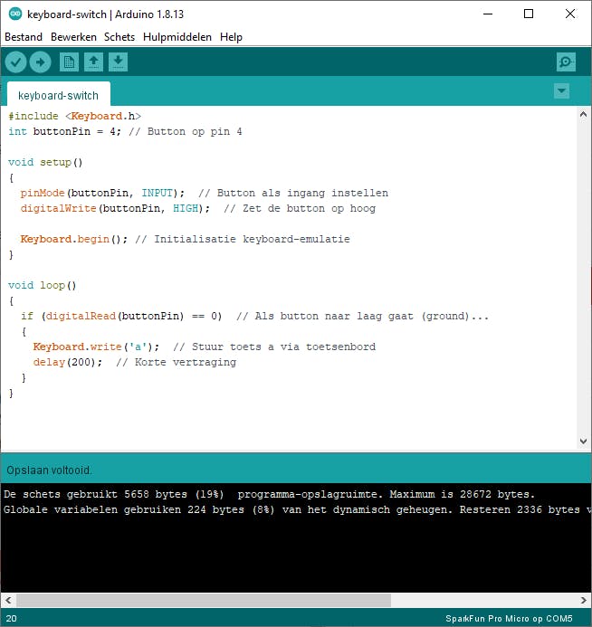 De Pro Micro kan zich dankzij de volledige usb-functionaliteit als muis of toetsenbord gedragen. We beginnen met een eenvoudig voorbeeld waarin via een drukschakelaar een toetsaanslag wordt verstuurd. Hiervoor gebruiken we de standaard Keyboard-bibliotheek van Arduino. Van de drukschakelaar gaat één aansluiting naar ground (GND) en de andere naar een digitale ingang, hier pin 4. Als je het onderstaande programma start, zul je zien dat na het indrukken van de schakelaar de a-toets wordt ontvangen in bijvoorbeeld de teksteditor die je gebruikt. We voegen eerst de bibliotheek toe en definiëren de pin: