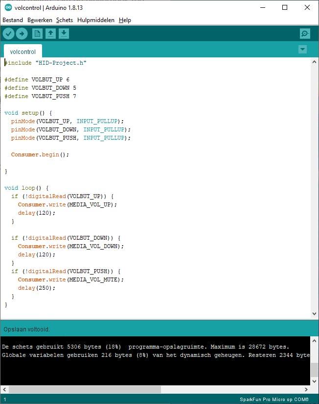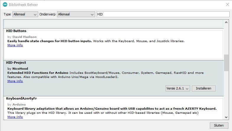De draaiknop kun je oneindig in beide richtingen draaien, waarbij linksom en rechtsom in feite aparte toetsaanslagen zijn. Je kunt de rotary encoder bovendien indrukken zoals een druktoets, wat we hier gebruiken om het volume op stil te zetten. Om de bibliotheek toe te voegen ga je in Arduino naar Schets / Bibliotheek gebruiken / Bibliotheken Beheren. Zoek de bibliotheek HID-Project op en kies Installeren.