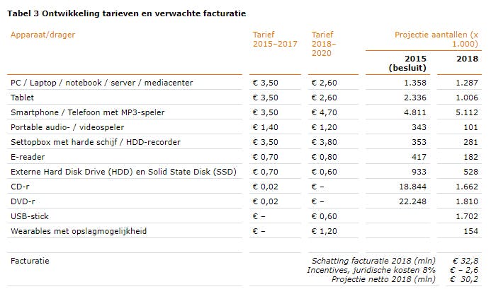 Interessant is dat er ook sprake is van een heffing op opslag in de cloud, maar dat het exacte bedrag is doorberekend in de overige heffingen. De nieuwe tarieven gelden minstens voor de komende drie jaar.