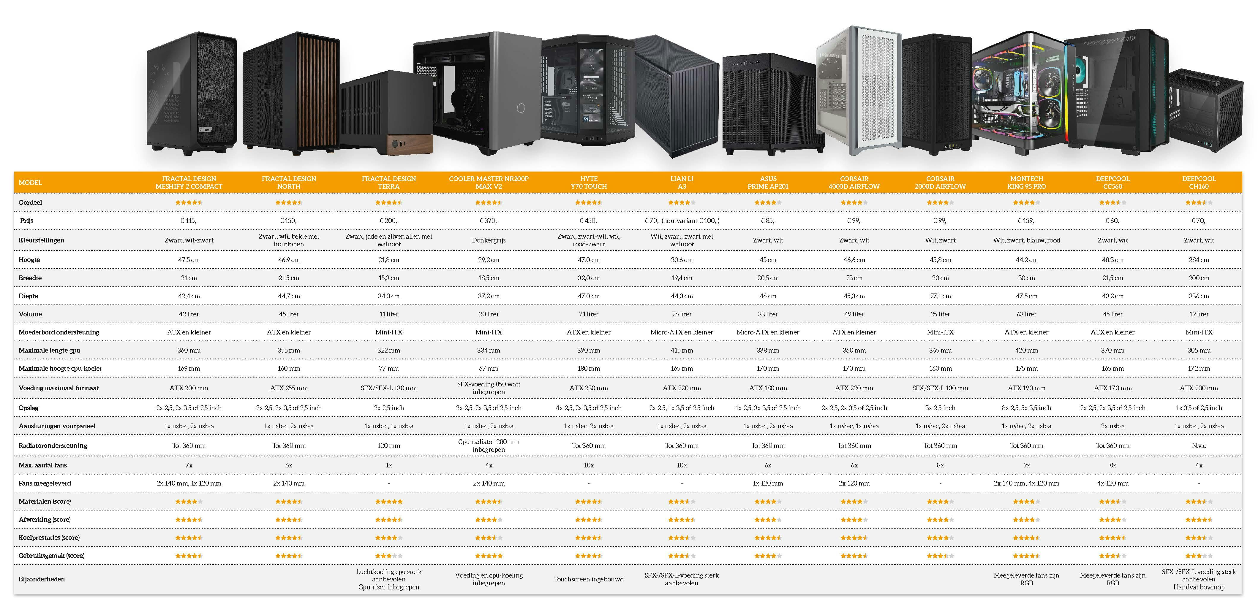 Ga je voor een echte top-end machine met een krachtige cpu, denk aan een Core i9, Core Ultra 9 of Ryzen 9 en een videokaart met een TDP van meer dan 250 watt, kies dan een van de kasten met vier of vijf sterren voor koelprestaties in de tabel (zie onderaan dit artikel).