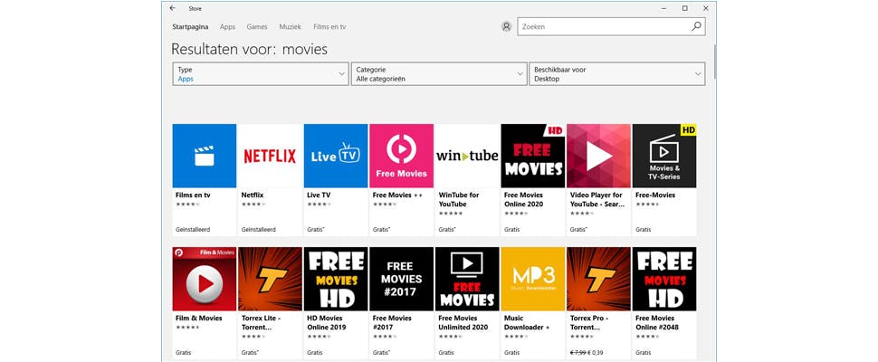 Dat meldt Torrentfreak vandaag. Wie in de Windows Store zoekt op 'Movies' stuit naast een handjevol legale apps als Netflix en bewerkingssoftware al gauw op tientallen diensten die films en series illegaal aanbieden.