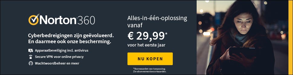 Een abonnement op Norton 360 Standard biedt bescherming voor één pc, Mac, smartphone en/of tablet en biedt je daarnaast 10 gigabyte opslagcapaciteit voor Cloud-backup. Tijdelijk betaal je voor dit abonnement geen 69,99 euro, maar slechts 29,99 euro voor het eerste jaar. Beveilig je online situatie vandaag nog en bekijk het Standaard-abonnement of een van de andere abonnementen of producten van Norton 360.