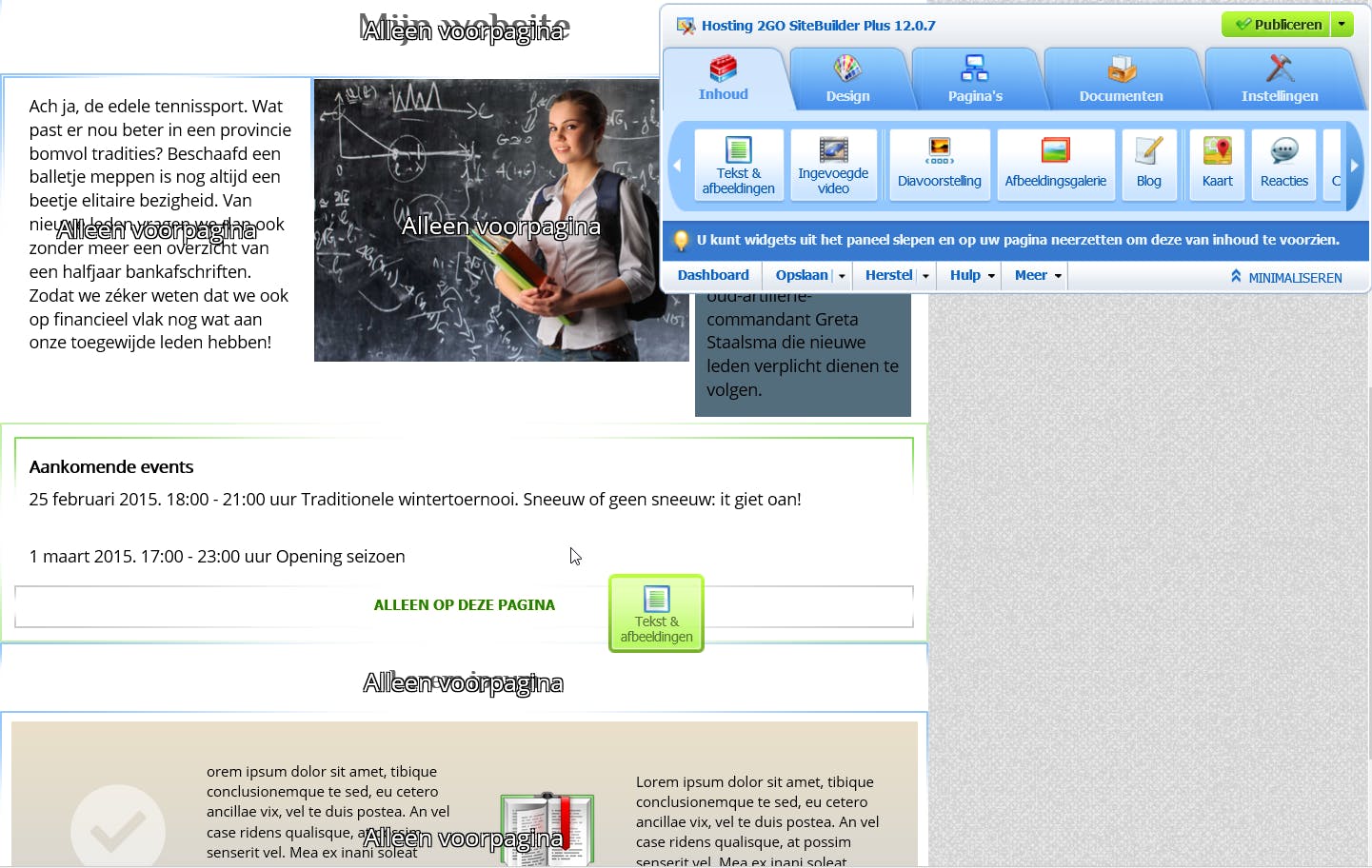 Toevoegen van een tekstvak doet u door eerst de gewenste pagina te openen via een klik in de menubalk op één van de pagina’s; in ons voorbeeld kiezen we voor Nieuws en evenementen. Klik vervolgens in het bedieningspaneel op de tab Inhoud (1) en sleep dan het onderdeel Tekst & afbeeldingen naar de gewenste locatie. Het is daarbij even opletten, want u ziet tijdens deze actie ten eerste mogelijk een paar onderdelen van andere pagina’s verschijnen. Dat dit gebeurt heeft waarschijnlijk te maken met het feit dat sommige onderdelen desgewenst ook op álle pagina’s getoond kunnen worden. Laat u zich er niet al te veel door afleiden, wij willen een tekstblok met nieuwsberichten onder het blokje met Aankomende events zetten. Mik goed, want door een beetje naar boven of beneden te gaan met uw muiscursor ziet de u de optie ALLEEN OP DEZE PAGINA of OP ALLE PAGINA’S verschijnen. Laat de muisknop alleen los bij de eerste optie.