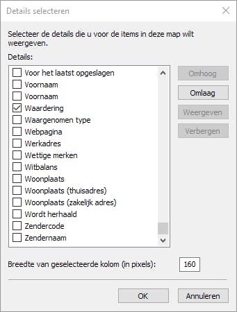 Je kunt makkelijk deze exif-gegevens in kolommen weergeven. Op die manier is het in Verkenner mogelijk bijvoorbeeld foto’s te rangschikken op sterwaardering. Het probleem is dat standaard de kolommen voor deze meta-gegevens verborgen zijn. Hoe haal je die tevoorschijn? Open de map met de afbeeldingen die je wilt bekijken en activeer in het tabblad Beeld de weergave Details. In deze weergave gebruik je bovenaan de knop Kolommen toevoegen. Normaal staan daar de opties Datum, Type, Grootte en Labels geactiveerd, maar als je op Kolommen kiezen klikt, kom je op een lange lijst van meta-criteria die je kunt aanvinken. Selecteer de gewenste details (bijvoorbeeld Waardering) en klik op OK. Hierdoor verschijnt er in Verkenner een nieuwe kolom voor deze gegevens.