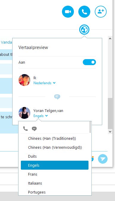 Heb je de nieuwste versie van Skype geïnstalleerd, dan zie je in gesprekken nu een wereldbol-icoontje. Klik daarop om de vertaalfunctie in te schakelen.