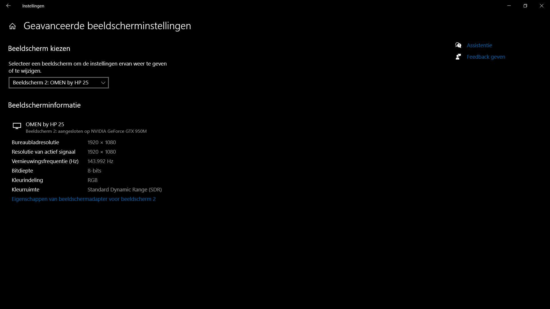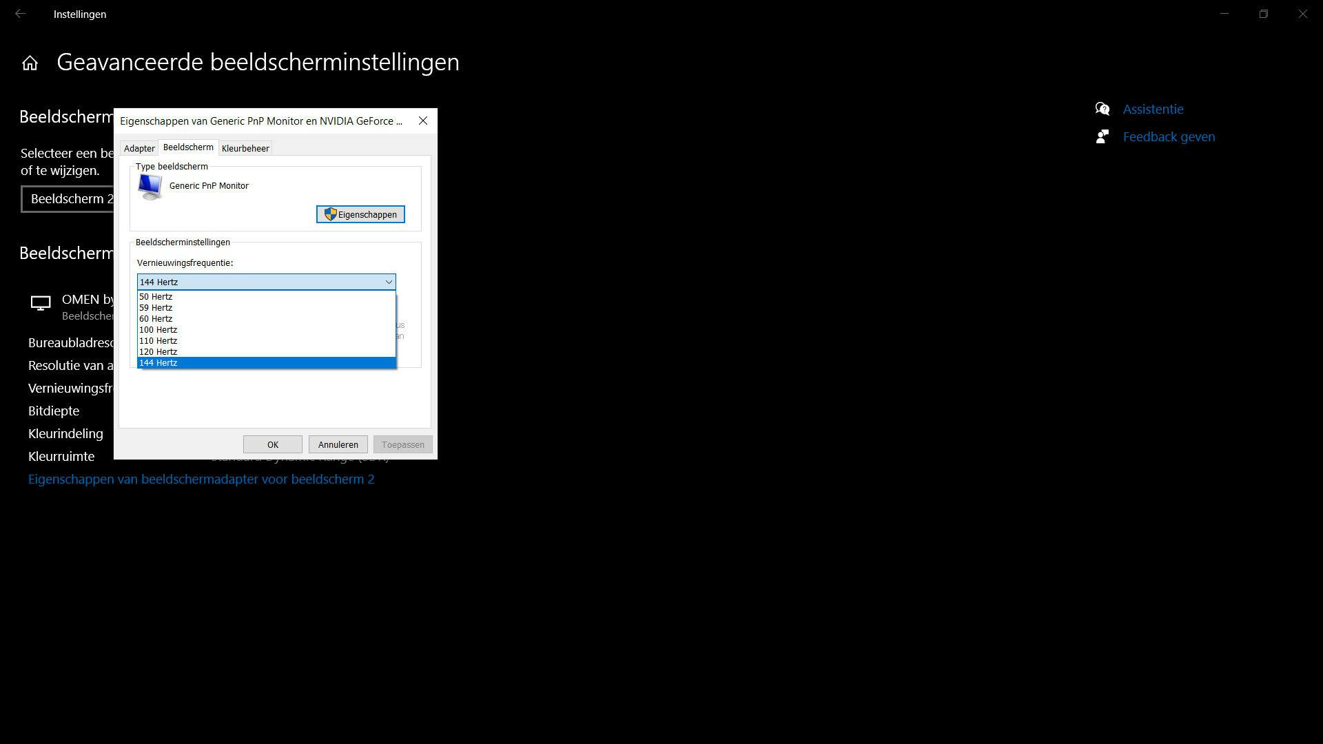 Nu verschijnt er een klein venster in beeld met drie tabs bovenin. Selecteer de tab Beeldscherm en druk onder Beeldscherminstellingen en Vernieuwingsfrequentie op de pijl voor het dropdownmenu. In dat menu staat alle opties die beschikbaar zijn voor jouw beeldscherm. Als het goed is staat hier ook het maximale aantal Hertz dat beschikbaar is voor jouw display. Mocht dat niet zo zijn, dan moet je misschien wisselen van kabels.