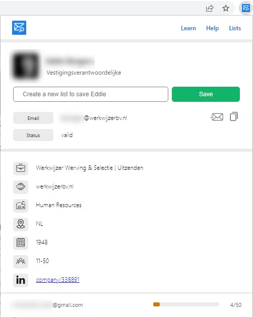 Je zet de plug-in eenvoudig aan het werk. Ga naar een LinkedIn-profiel van een persoon waarvan je het e-mailadres wilt achterhalen. Klik vervolgens op het pictogram met de envelop. Met een beetje mazzel verschijnt er in het pop-upvenster contactgegevens met het gewenste e-mailadres. Skrapp is een handig hulpmiddel wanneer je af en toe eens een zakelijk e-mailadres wilt achterhalen. Met een gratis account kun je maandelijks vijftig e-mailadressen opvragen.