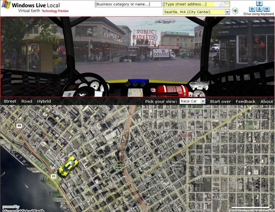 Volgende week komt er een nieuwe functionaliteit in Windows Live Local (voorheen VirtualEarth). Met de nieuwe functionaliteit genaamd StreetSide kunt u met een virtuele auto door de steden Seattle en Sand Fransisco rijden en deze steden bekijken vanuit het oogpunt van de bestuurder. Met StreetSide ziet u een stad door de voorruit van een auto. Het is net alsof u door de map rijdt. De preview versie is gelanceerd om feedback te krijgen van gebruikers. Door de grote hoeveelheden afbeeldingen die nodig zijn – alleen voor Seattle al meer dan 10 miljoen foto’s - heeft Microsoft de rollout beperkt tot een klein aantal testers.