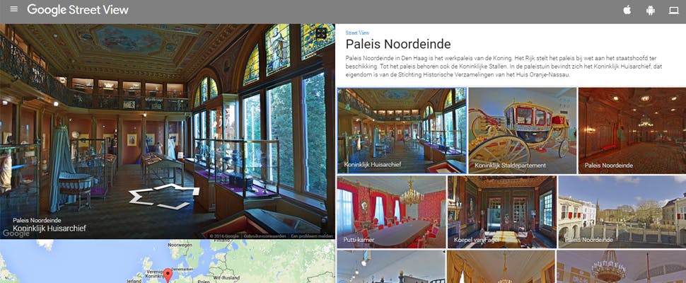 De speciaal ingerichte Noordeinde-sectie van Google Maps laat je gemakkelijk tussen verschillende delen van het paleis springen. Naast de riante ontvangsthal zie je waar de vergaderingen plaatsvinden, maar je kunt ook de stallen van dichtbij bekijken. Inclusief paarden en gouden koetsen.