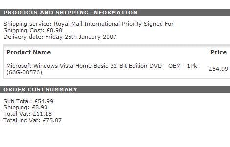 Inclusief levering en VAT (dat is de Engelse variant van BTW) kost dat 75,07 Pond, wat neerkomt op ongeveer 112 euro. Da's heel wat voordeliger dan de 279 euro voor de niet-OEM variant. Dat laatste lijkt overigens niet geheel legaal, aangezien een dergelijke OEM-licentie alleen geldt voor levering bij een nieuwe pc. Naast deze versie biedt de webwinkel een keur aan andere varianten aan van Windows Vista, waaronder Ultimate en 64 bits edities.