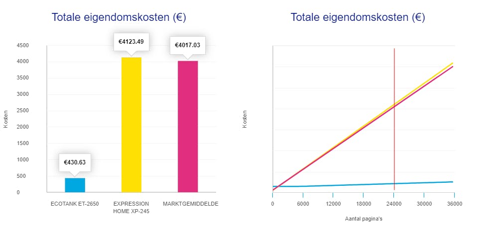 Bij relatief een klein aantal afdrukken per maand blijken de verschillen in die eigendomskosten tussen printers na zo’n 4 jaar gebruik gigantisch te zijn. Reden hiervoor is dat veel modellen na aankoop jaarlijks nog eens honderden euro’s kosten waardoor de paginaprijs al snel boven de 10 cent komt te liggen, zo blijkt uit een handige online calculator van Epson. Dit rekenmodel ontkracht ook de mythe dat een laserprinter bij hogere aantallen altijd goedkoper is dan zijn inkjetbroertje. Het tegendeel blijkt vaak waar.